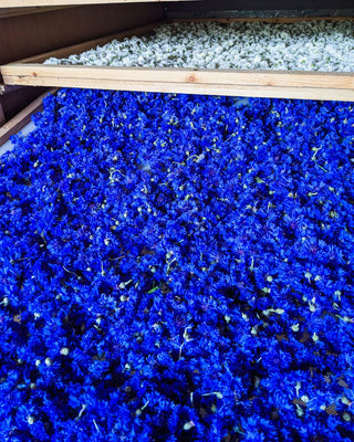 Notre champ principal abrite une quarantaine de variétés de plantes aromatiques et médicinales, cultivées sur près de 5000 m2. Semis et plantations au printemps, explosion des récoltes en été : ici, le travail s'effectue manuellement, toujours au plus près des plantes. Nos champs contiennent des zones laissées à l'état sauvage, dans lesquelles nous laissons s'exprimer la biodiversité. Nous y glanons certaines médicinales comme le plantain lancéolé, l'aubépine ou encore la carotte sauvage. La proximité permanente avec le vivant nous permet d'obtenir des plantes pleines de bienfaits et riches en principes actifs.