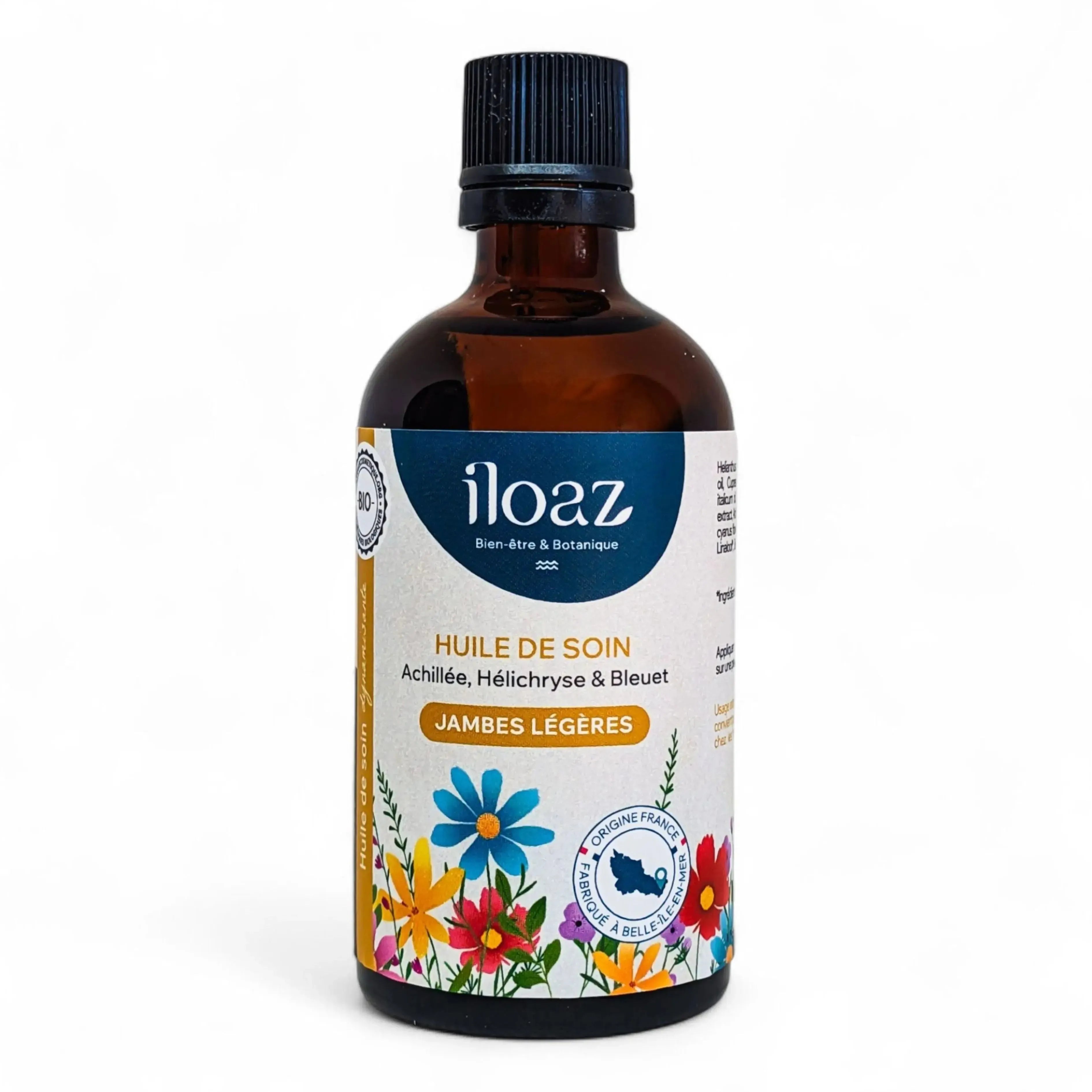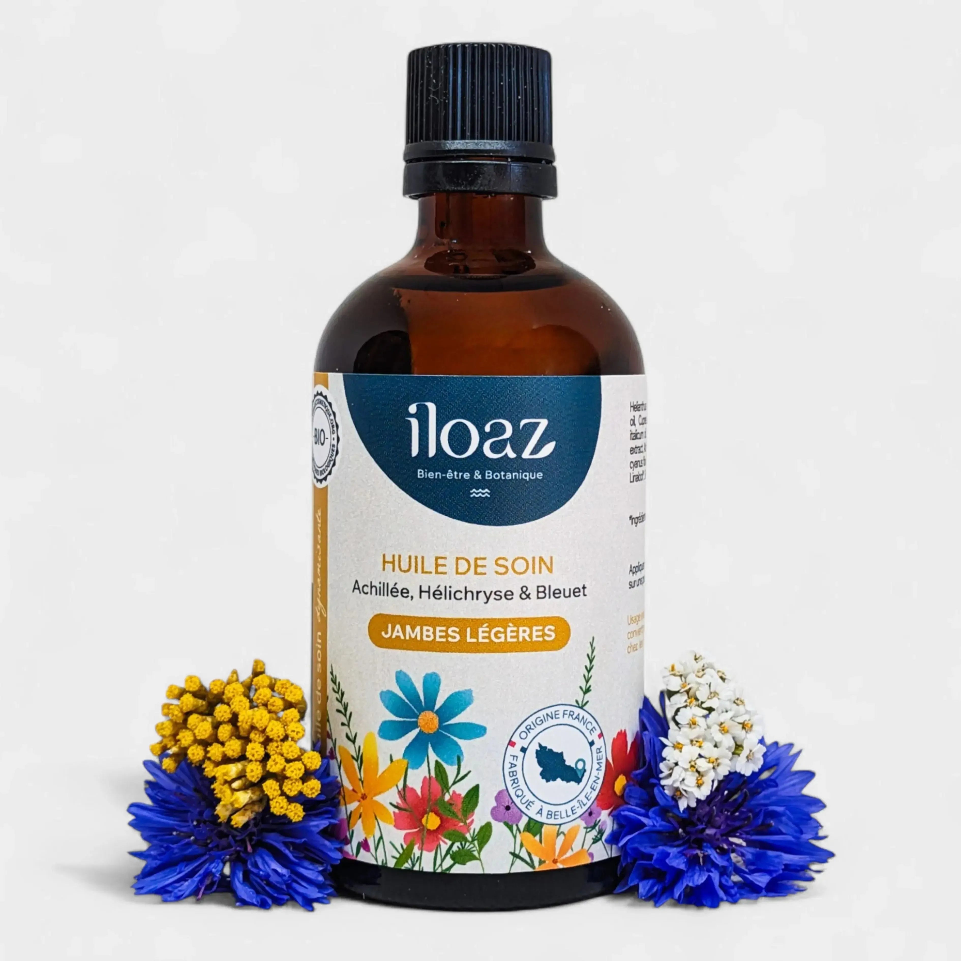 L’huile de bien-être jambes légères Iloaz allie l’essence du bleuet, de l’achillée et de l’hélichryse de Belle-île-en-mer, avec des ingrédients naturels hautement sélectionnés. Les procédés d’obtention de ces ingrédients préservent les principes actifs des plantes, tout en respectant l’environnement. Le circuit court et les partenariats avec d’autres agriculteurs engagés sont systématiquement privilégiés.